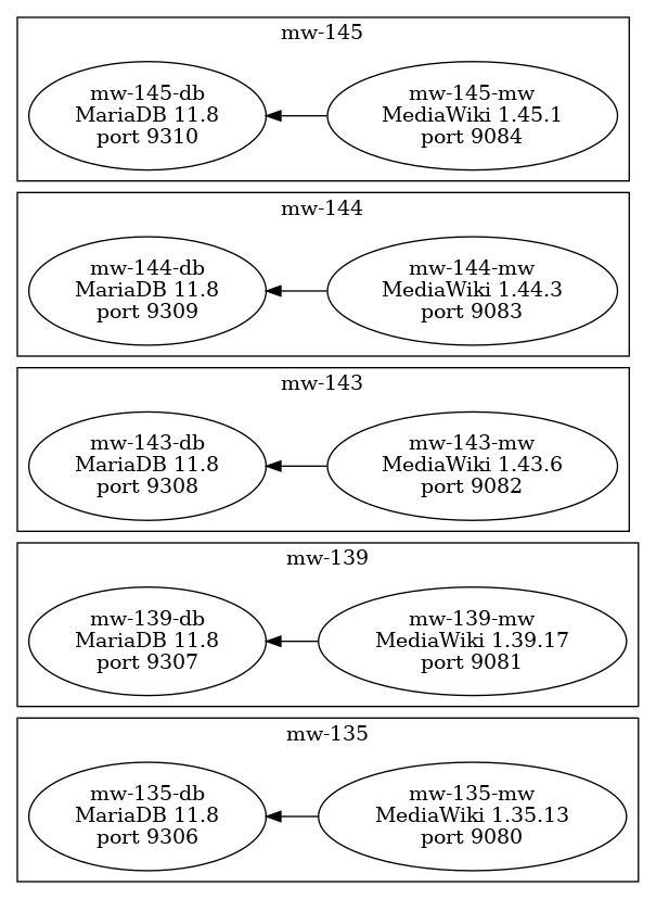 The core concept is a "MediawikiCluster" that is a set of docker applications that run MediaWiki instances with varying versions of MediaWiki and the underlying database. The graphic belows shows the docker containers which are created for different versions of Mediawiki